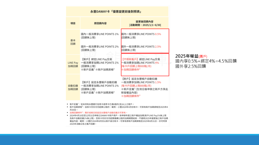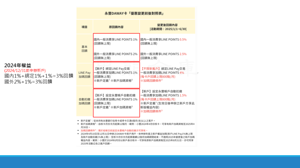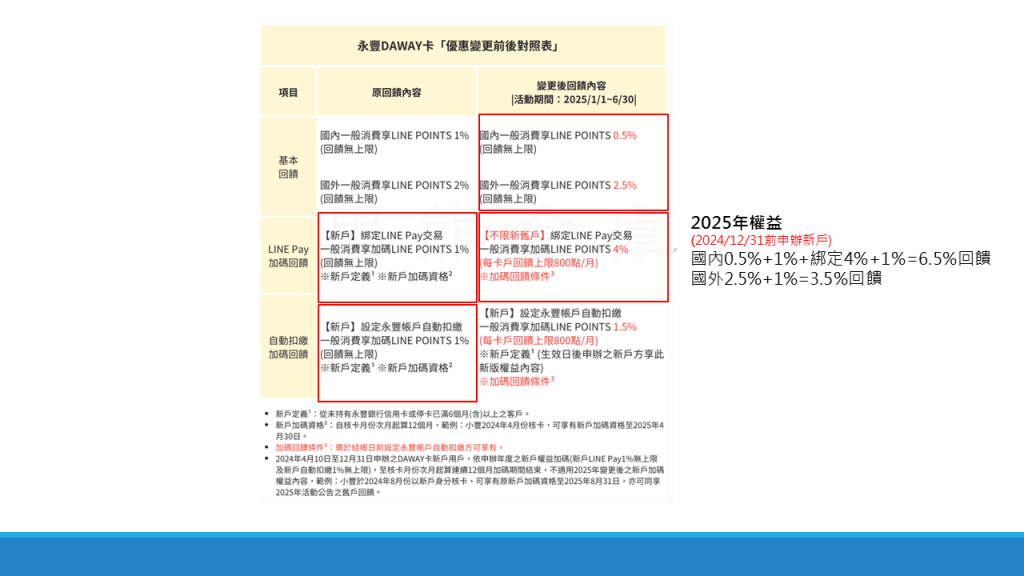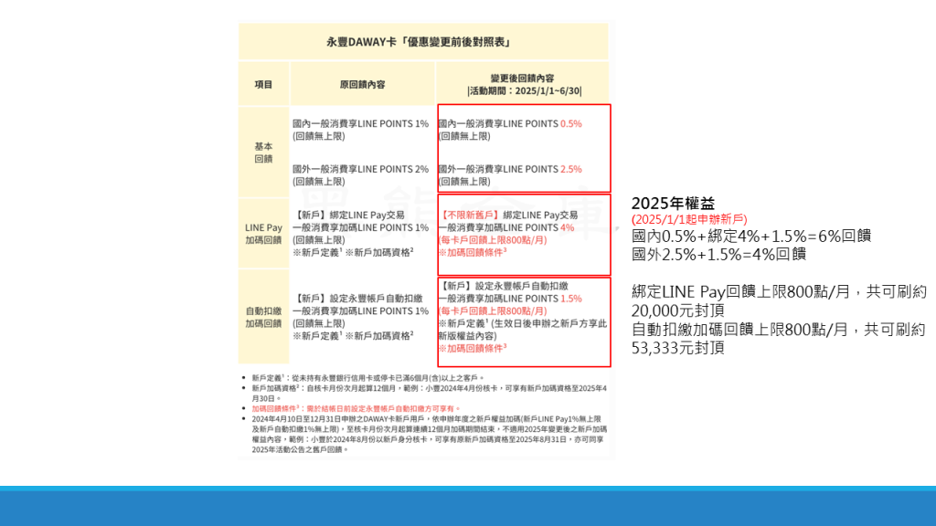 永豐DAWAY卡自2025/1/1~2025/6/30,將進行新的LINE POINTS回饋方案調整。本次調整針對國內外一般消費回饋率、LINE Pay加碼回饋以及自動扣繳加碼回饋進行了升級,讓持卡人享受更豐富的回饋內容,以下是調整後的權益變動解析。